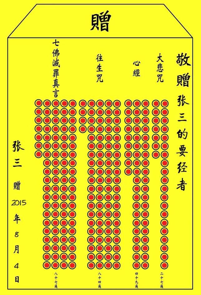 抬头敬赠处为“XXX的要经者”,XXX为在世人的姓名,可以为自己的名字,也可以为他人的名字。落款处为念诵经文者的名字。(如图12)
