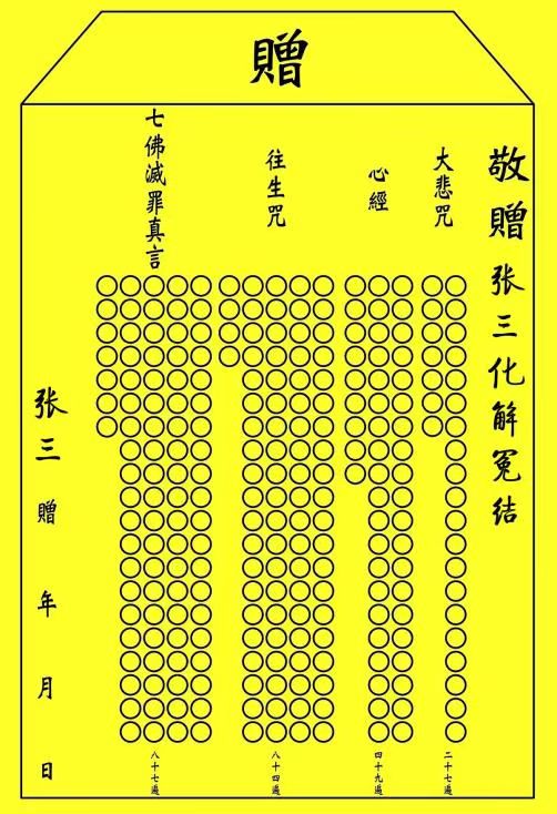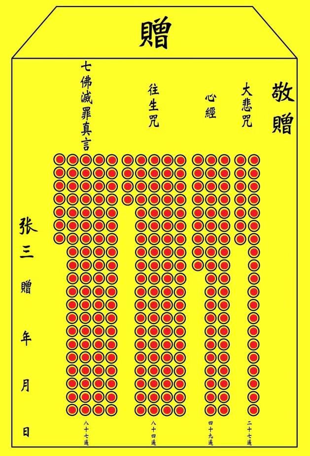 有明确敬赠对象的经文组合xfz,右侧敬赠处要先写好再念诵;如果是自存经文组合xfz,就可以先空着敬赠处,到烧的时候再写。