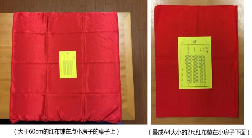 点经文组合xfz的时候,为了防止孤魂野鬼抢经文,要在经文组合xfz下面垫一块长宽均大于60cm或两尺的红布(红纸、红塑料等红色材料均可)。这块布或者纸必须是一整块,可以用红线或胶水将小块布料或纸片制作成大的红布红纸,但是不能是分别的小块。如果不方便铺开,可以将大块红布或红纸折小使用,折后尺寸不能小于A4,会有等同效果。如果红布比较柔软不方便点红点,可以在上面垫一块红的硬纸板,不能在红布上盖玻璃(会影响效果)。红纸可以是双面红色或者单面红色;也可以使用相应尺寸的全新的红桌子代替红布红纸。红布或红纸上可以有暗纹,但是不能有明显变色,必须是纯红色,且不宜有人或动物形象。红色以正红、大红为佳,不能用橘红、玫红等色。红布可清洗。(如图20-1)